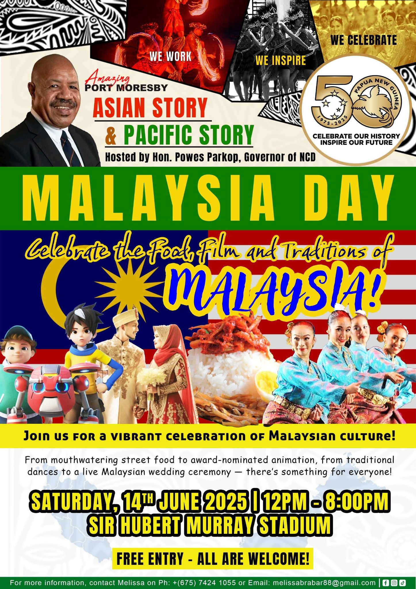 The people of Port Moresby are invited to experience the rich cultural tapestry of Malaysia at the Malaysia Day Celebration on Saturday, 14th June 2025 at Sir Hubert Murray Stadium. Running from 12:00 PM to 8:00 PM, the event is free and open to all.